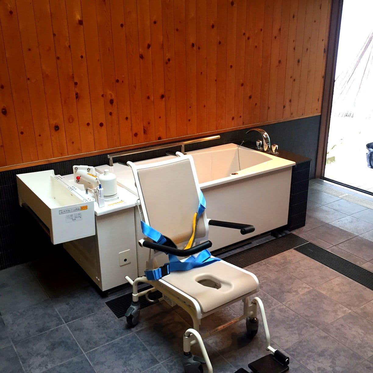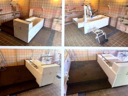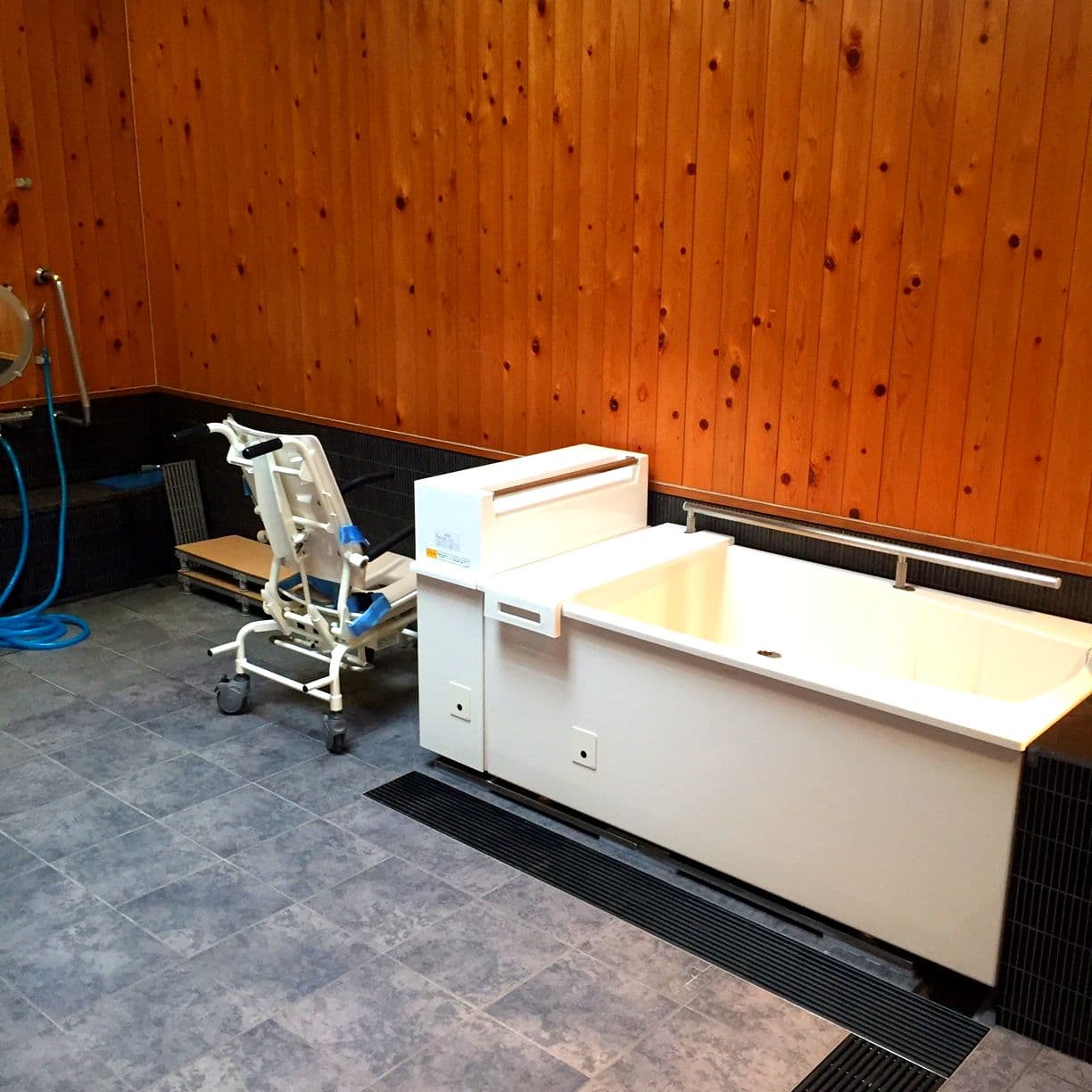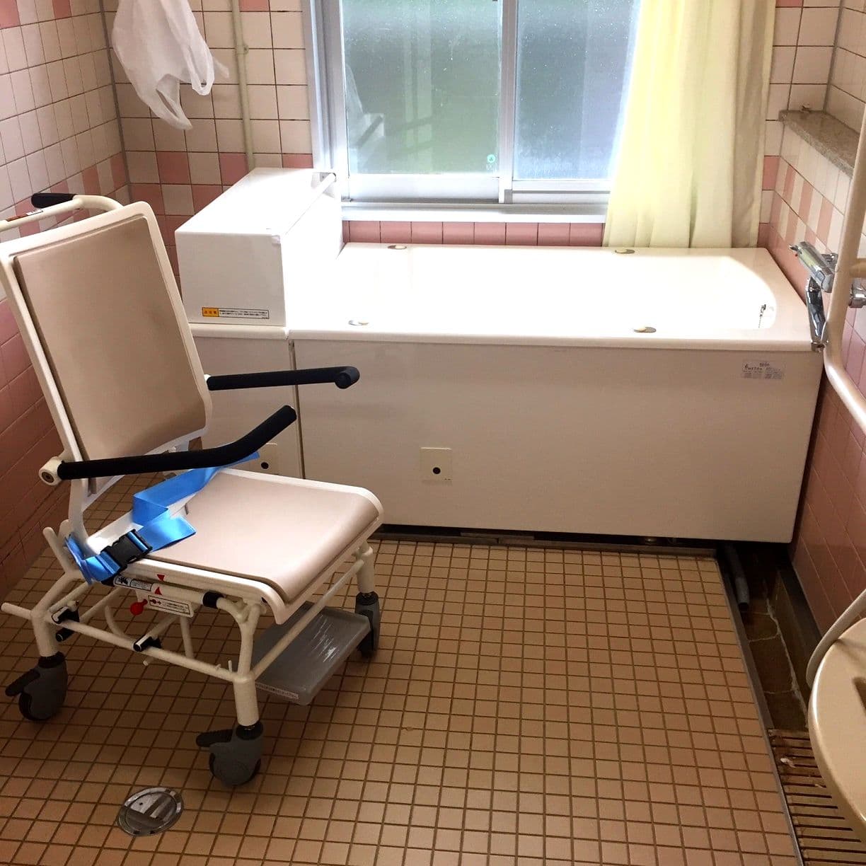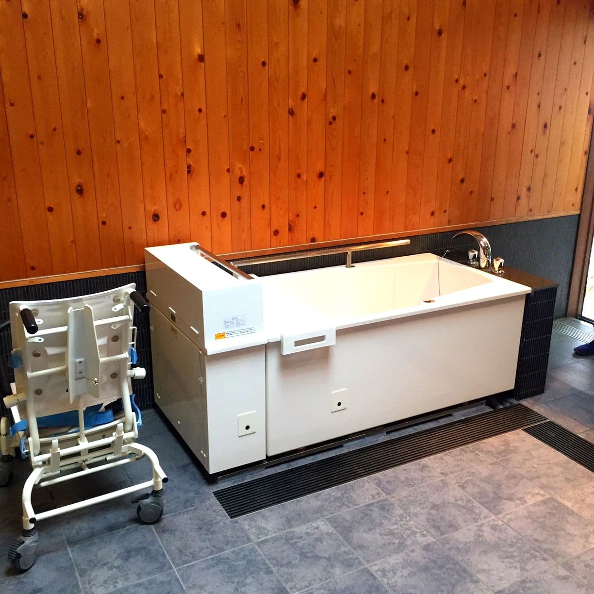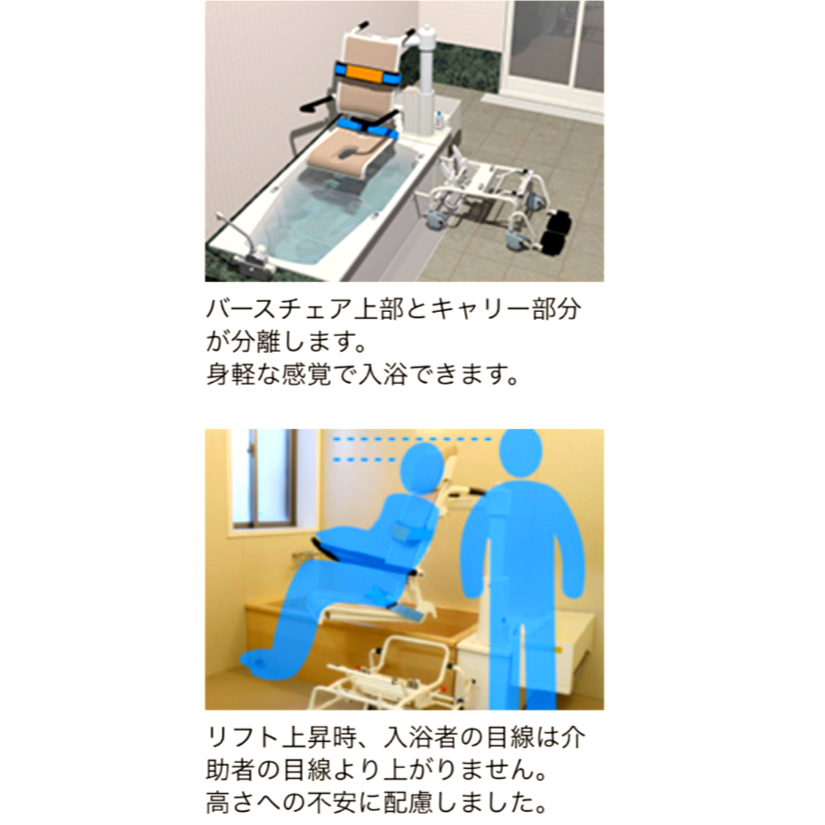 低床ベッド・車椅子・ストレッチャーからの移乗がしやすく、介護もしやすいように、電動昇降ストレッチャーの高さは43㎝から90㎝まで調整できます。ストレッチャーに寝た状態で入浴するので、寝たきりの方にも対応できます。